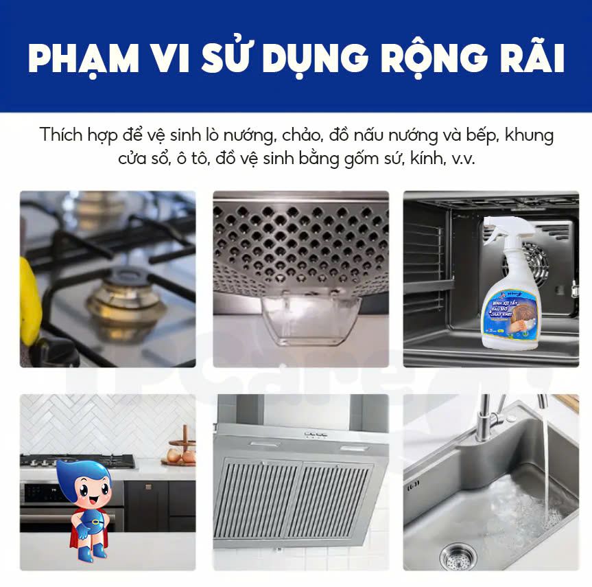 Đa năng tuyệt đối: Làm sạch hoàn hảo lưới lọc máy hút mùi, bếp ga, bếp từ, lò vi sóng, lò nướng và đặc biệt là các vết cháy đen dưới đáy xoong nồi.