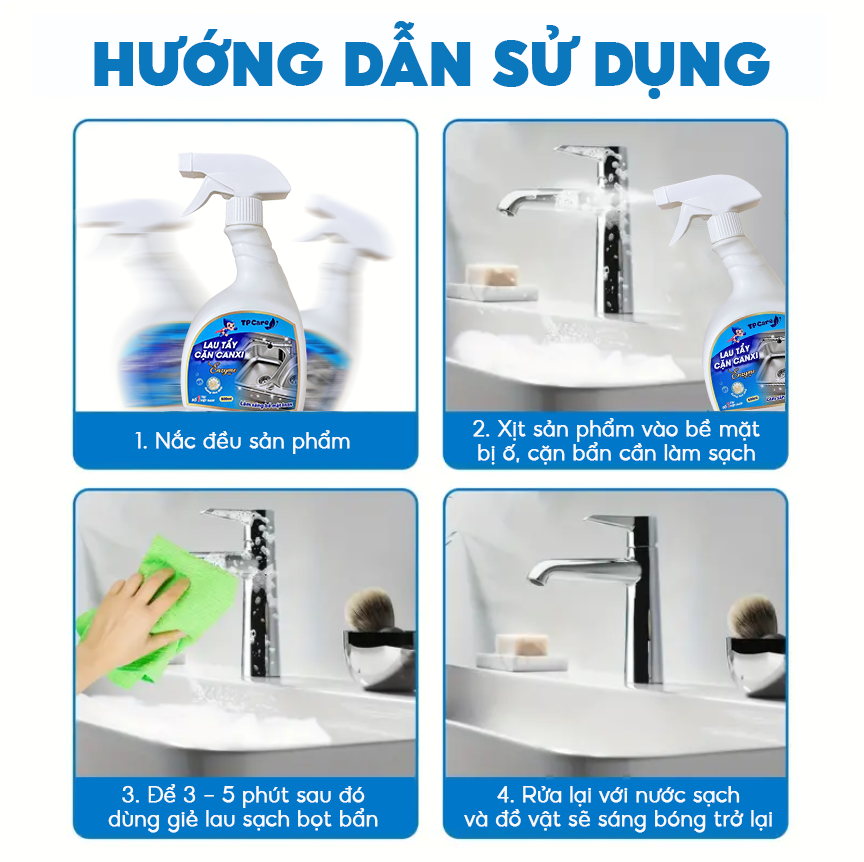 Dọn dẹp phòng tắm không nhất thiết phải là công việc nặng nhọc, tốn nhiều thời gian và công sức. Với nước tẩy cặn canxi TPCare, toàn bộ quy trình vệ sinh được tinh gọn tối đa, chỉ cần 5 phút với 3 bước đơn giản là có thể mang lại sự khác biệt rõ rệt cho không gian nhà tắm.