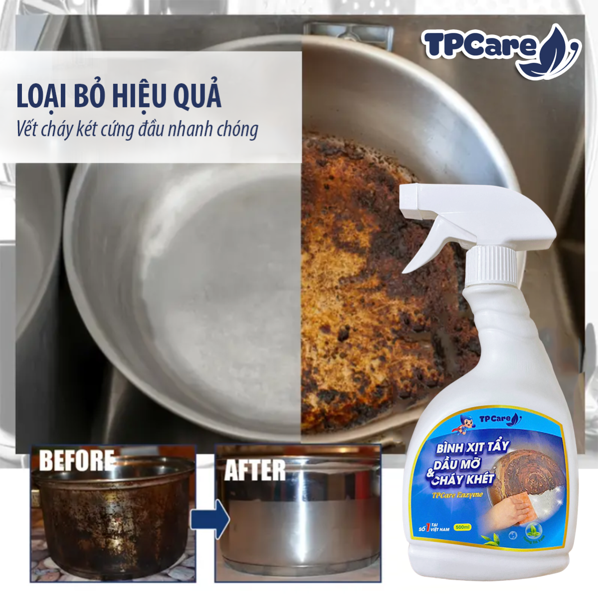 Đối với những trường hợp nồi bị cháy nặng, bám cặn lâu ngày hoặc đã thử nhiều cách nhưng không hiệu quả, việc sử dụng dung dịch chuyên dụng là giải pháp tối ưu. Nước tẩy dầu mỡ cháy két TPCare được thiết kế để xử lý nhanh các vết cháy đen, dầu mỡ tích tụ cứng đầu trên bề mặt nồi, chảo.